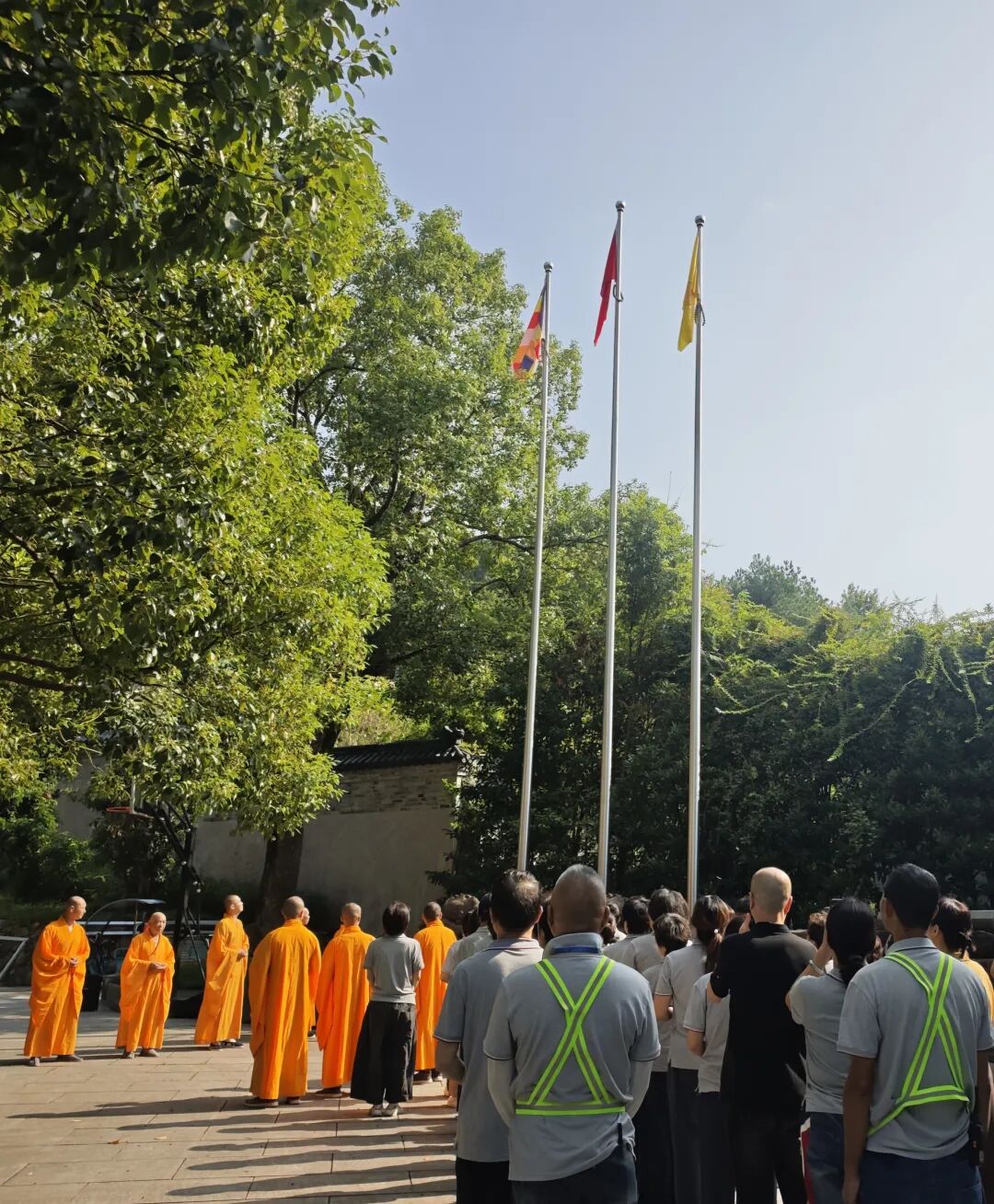 清晨时分,寺内僧众、护法居士以及善信齐聚山门广场。伴随着雄壮激昂的“义勇军进行曲”,鲜艳的五星红旗在众人的庄严注目下冉冉升起,迎风飘扬于古刹上空。